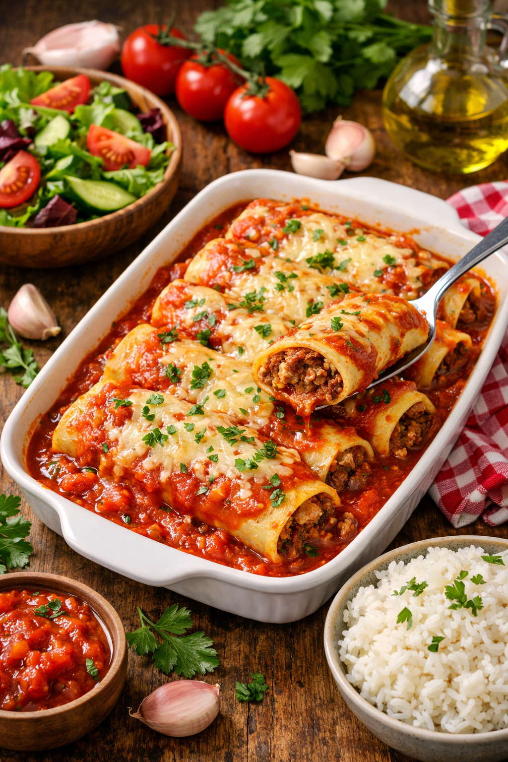 Imagine the aroma of onions and garlic cooking with ground meat while the tomato sauce gently simmers in the pan. Each pancake is carefully filled, rolled, and baked until warm and flavorful. Every bite is soft, juicy, and satisfying.